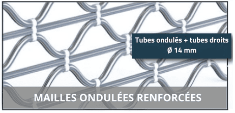 - Tubes acier droits de 14 mm de diamètre en acier Z275, assemblage par maillons articulés d’une très grande robustesse.